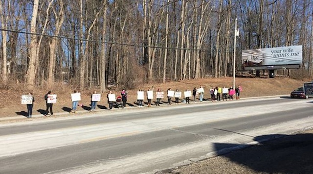 Feminist students from Siena College in upstate New York protest local billboard advertising a kitchen